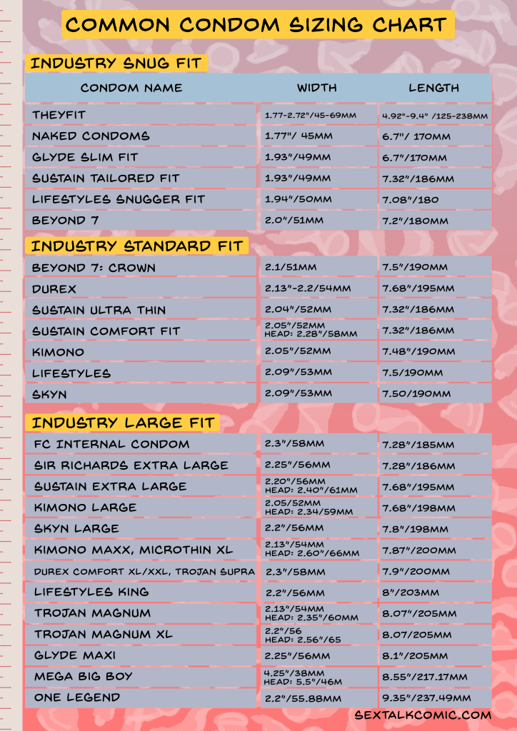 For even more thorough coverage of condom sizes check out https://www.condom-sizes.org/ which also provided an incredible reference for this chart!